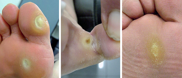 Los callos suelen aparecer en la parte superior y lateral de los pies y entre los dedos. Son benignos y también se pueden encontrar en zonas que soportan peso.Los síntomas incluyen la aparición de protuberancias endurecidas y elevadas rodeadas de piel inflamada. Pueden causar dolor al presionarlas.Las medidas de cuidado personal consisten en usar zapatos con el calce adecuado y almohadillas protectoras. .